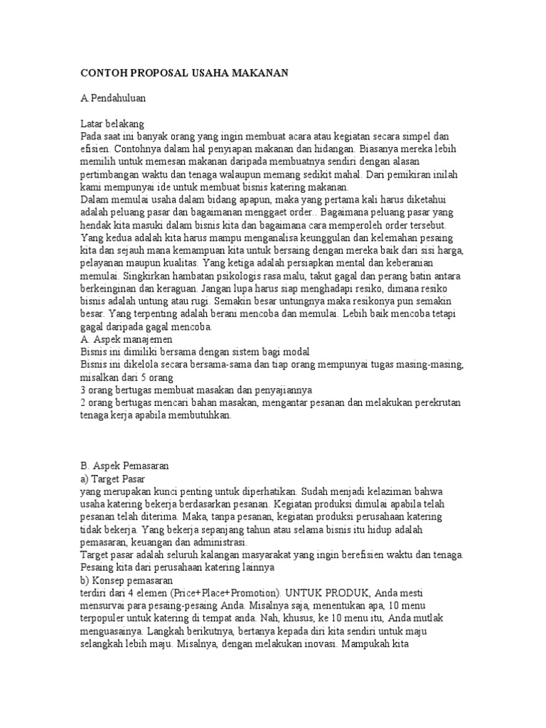 Bentuk dari proposal juga sangat bervariasi, tergantung dengan jenis organisasi yang menulisnya. Untuk sebagai inspirasi usaha makanan apa saja yang bisa anda jalakan dibawah ini ada contoh proposal usaha makanan yang bisa anda. Beranda » contoh proposal » permohonan » contoh proposal pengajuan sewa kantin. Saya menyadari bahwa penyusunan proposal ini masih jauh dari sempurna. Berikut adalah contoh cover proposal usaha makanan yang bisa digunakan.